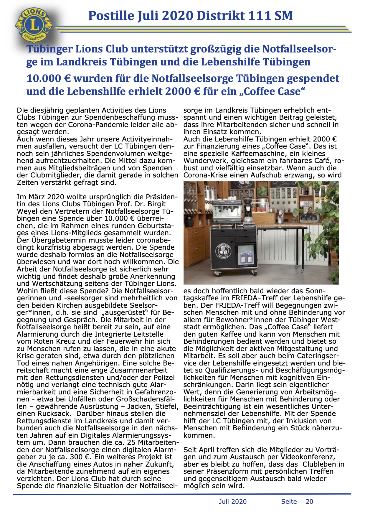 Der Lions Club Tübingen unterstützt die Notfallseelsorge.